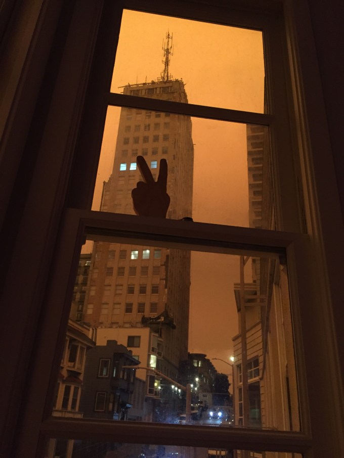 Waking up to this red day this morning was something. Today is something. It’s som’in’ new. It – a combination of that good ol’ Bay Area fog and trapped smoke, from the wildfires that have been burning this month out here in Northern California, per Mayor London Breed – is a new reality. This is how WALL-E happens. We overproduce environmental waste, it gets stuck in our atmosphere, the haves go to space to get fat.